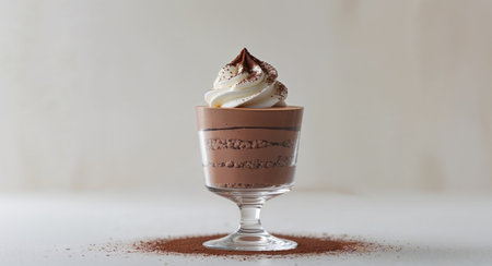AI Generated. Gourmet Dessert Presentation Layered Chocolate Mousse in Modern Glass with Whipped Cream and Cocoa Powder - Luxury Dining Content and Artisan Patisserie Promotion