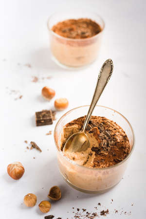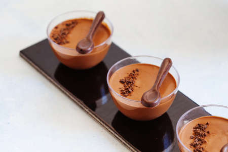 Chocolate low calorie mousse in portion glasses, fluffy vegan dessert with chocolate decorations