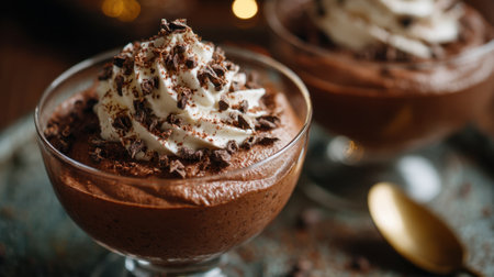 This dessert showcases creamy chocolate mousse adorned with whipped cream and chocolate shavings, served in stylish glass bowls. Perfect for a festive gathering or special occasion.