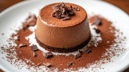 This visually appealing chocolate mousse dessert features a smooth and creamy texture topped with shaved dark chocolate, perfect for any sweet occasion.