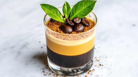 A tempting layered coffee dessert featuring rich layers of chocolate, coffee, and cream garnished with aromatic coffee beans and fresh leaves.