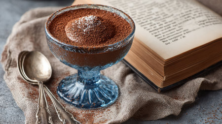 A tempting chocolate dessert presented in a stylish glass bowl, topped with cocoa powder, paired with vintage silver spoons and an open book, evoking a cozy ambiance.