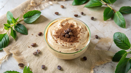 A delectable creamy coffee dessert topped with roasted coffee beans, showcasing a rich and tantalizing texture, ideal for coffee lovers and dessert enthusiasts.