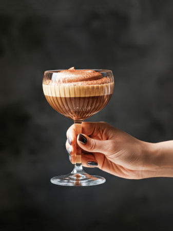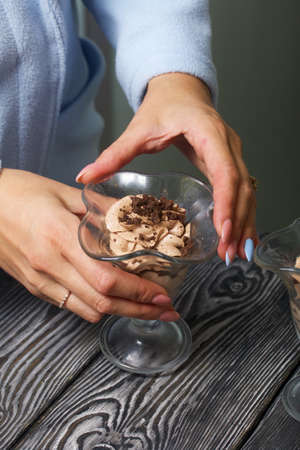 Delicious coffee dessert with whipped cream and coffee beans in a dark chocolate cup. A hand holds a small cup of coffee-flavored dessert with a chocolate spoon, perfect for a sweet treat Autumnal day
