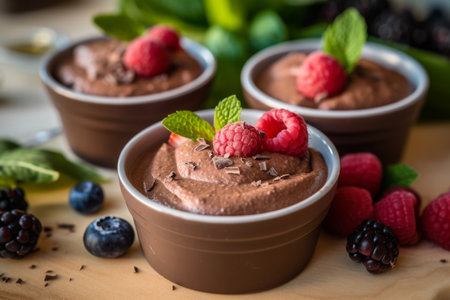 healthy chocolate mousse pudding with fresh raspberries and mint