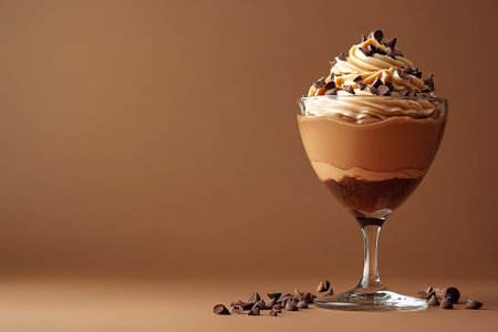 Appetizing chocolate dessert with whipped cream in an elegant glass on a brown minimalistic background.