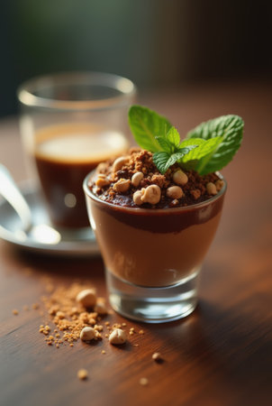 A rich chocolate mousse dessert sits elegantly in a glass, garnished with crushed nuts and a fresh mint leaf, beside a steaming coffee cup. The warm, inviting atmosphere enhances the indulgence.