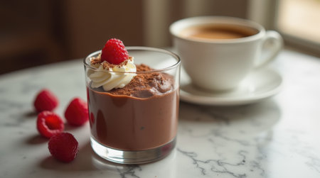 A rich chocolate mousse topped with whipped cream is displayed in a glass, next to a warm cup of espresso. Fresh raspberries add a touch of color in a cozy cafe atmosphere.