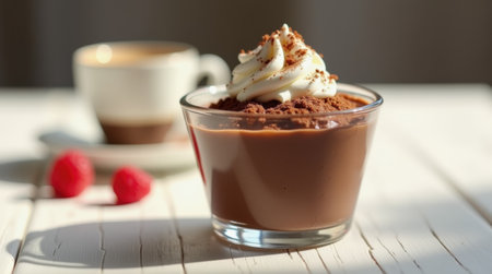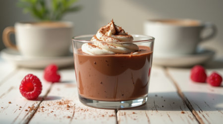 A decadent chocolate mousse is topped with whipped cream and cocoa powder, accompanied by fresh raspberries and two cups of coffee in the background, evoking a cozy atmosphere.