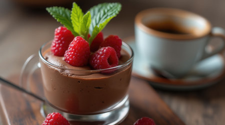 A delightful dessert of velvety chocolate mousse is elegantly garnished with plump raspberries and a sprig of mint, accompanied by a steaming cup of coffee on a rustic wooden table.