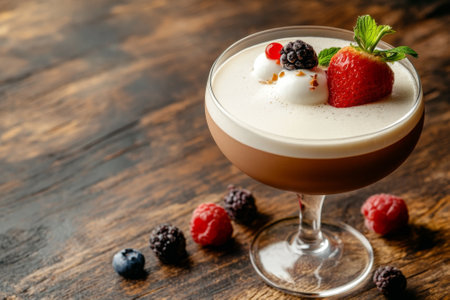 Delicious chocolate cocktail decorated with berries and mint on a wooden table