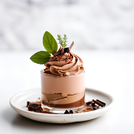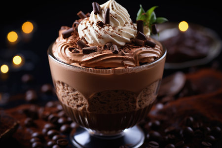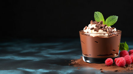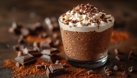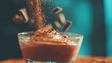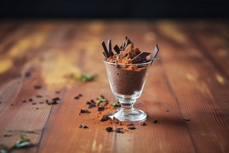 Decadent mousse au chocolat in glass with cocoa powder splash for dessert delight