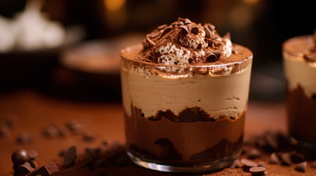 A stunning presentation of a rich chocolate dessert in a glass, topped with creamy layers, floating chocolate pieces, and a bokeh background that enhances the visual delight.