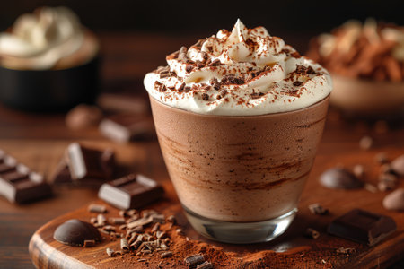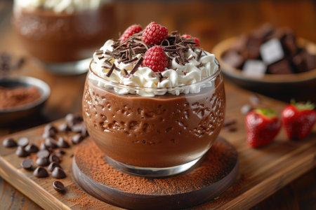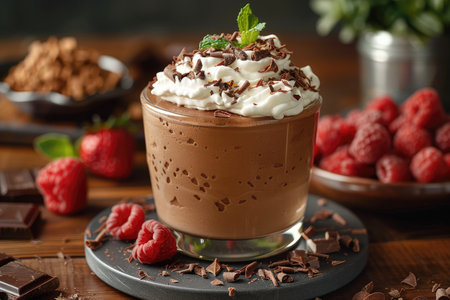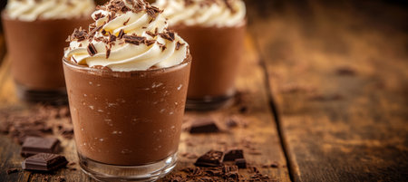 Indulgent Chocolate Mousse Dessert Served in a Glass with Whipped Cream and Garnish on Rustic Wood