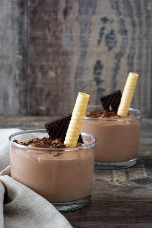 Homemade chocolate-nut mousse on the kitchen wooden background. Free space for your text.