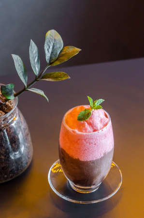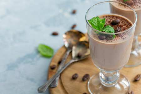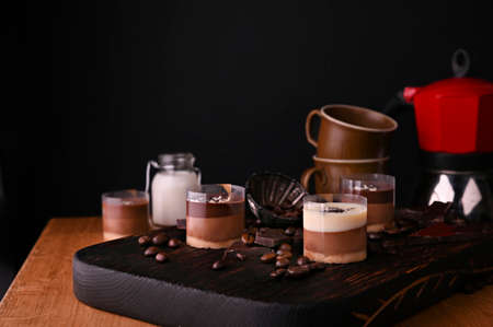 Glass with coffee Panna cotta on milk chocolate decorated with coffee beans and mint on a wooden serving board, selective focus.