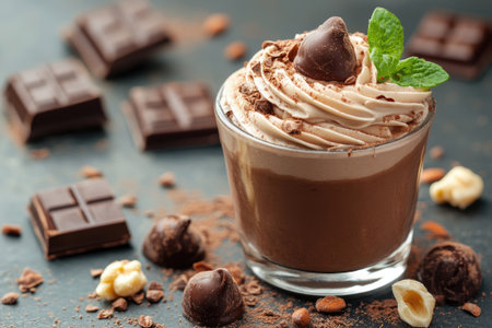 Chocolate mousse dessert served in a glass with whipped cream, chocolate pieces, mint and cocoa powder on a slate table
