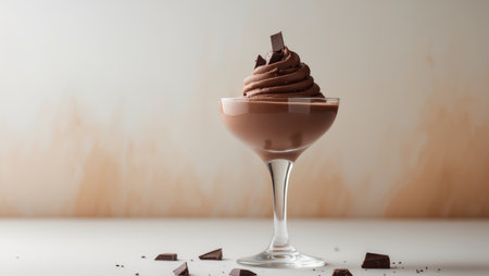 AI Generated. Rich chocolate mousse dessert in elegant glass with dark chocolate chunks