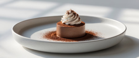 A sophisticated chocolate dessert topped with cocoa dust, served on a minimalist plate, embracing elegance by Generative Ai