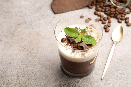 Delicious coffee panna cotta, beans and mint on grey table, closeup. Space for text