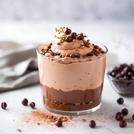 Artisanal chocolate mousse with cocoa and coffee bean garnish, close up