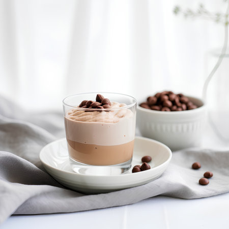 Homemade chocolate mousse in a glass with coffee beans on a white background