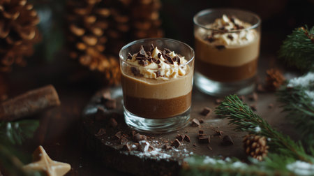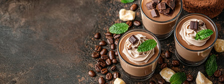 A stunning display of layered chocolate and cream desserts in elegant glasses, showcasing rich textures and inviting toppings, ideal for any special event or gathering.