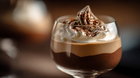 Capture the essence of indulgence with an 8K photograph of a rich and creamy chocolate mousse dessert, topped with whipped cream and chocolate shavings. The dessert should be presented in an elegant glass or ramekin. --ar 3:2 --stylize 1000 --v 6 Job ID: 14724c17-7f5e-4f27-95bb-ee4d5fda3ad1