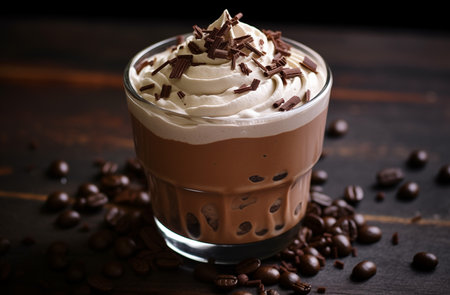 Dalgona coffee cocktail with whipped cream and cocoa powder on dark background