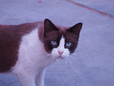 Close up cat, purebred kitten has three color looks at the owner hopeful face for food and sitting down on the concrete floor background. Yellow eyes Thai kitten has a Soft and fluffy hairy and furry.