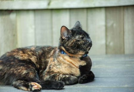 cute tortoiseshell cat enjoying herself outdoors