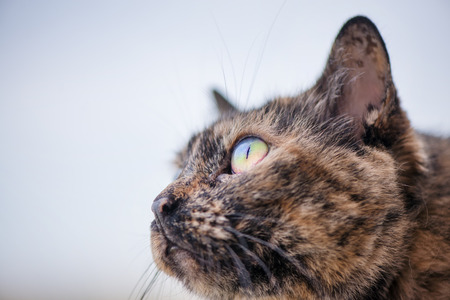 Beautiful brown and black cat with rainbow colored eye looking at the sky