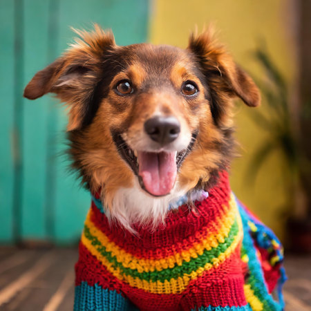 Portrait of a happy dog in a colorful scarf on a wooden background.