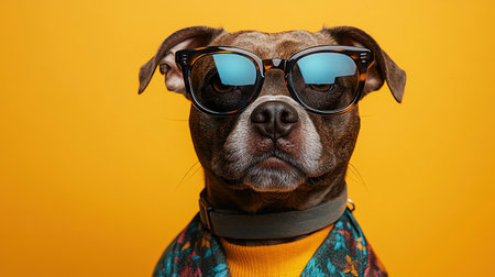 A fashionable dog in a colorful suit and sunglasses, posing confidently against a yellow background