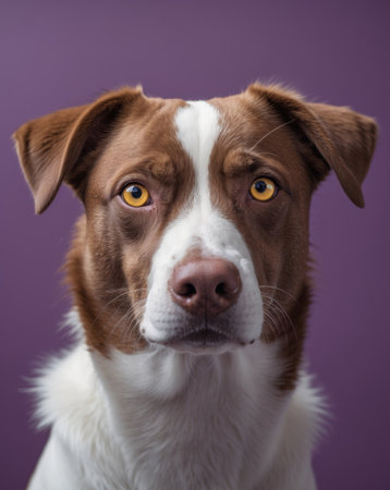 AI Generated. A brown and white dog with yellow eyes on a purple background