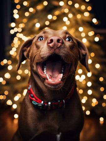Portrait of a cute chocolate labrador retriever dog over Christmas lights background.