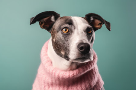 A cute mixed-breed dog with brown fur and a white chest looks directly at the camera in a studio setting. The canine wears a stylish pink and white scarf, isolated on a plain background.