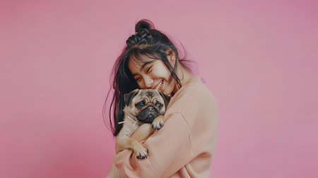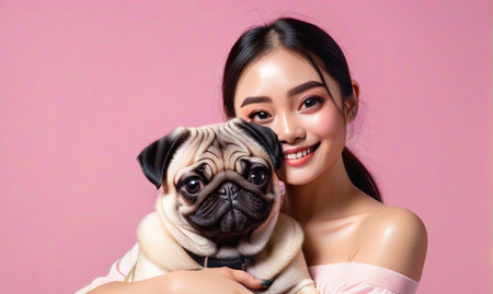 Beautiful young Asian woman holding a pug dog, ai generative