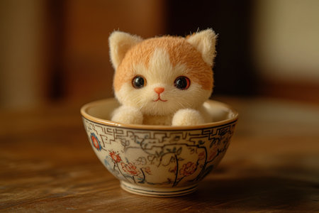 A cute stuffed cat toy sitting in an Asian-style bowl, with a simple background and warm colors, captured by a Canon camera for high-definition photography using an 85mm f/2.0 lens. --ar 3:2 --v 6.1 Job ID: 2dc12f6b-a339-43f8-8742-458daebacaf7