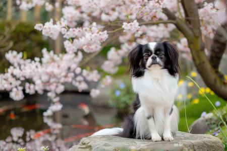 Japanese chin dog with cherry blossoms in a tranquil garden setting