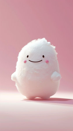 Cute fluffy character with a smiling face, standing against a soft pink background, embodying joy and playfulness, perfect for children s themes and illustrations