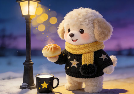 Cute toy dog with a cup of coffee and a cake in the snow