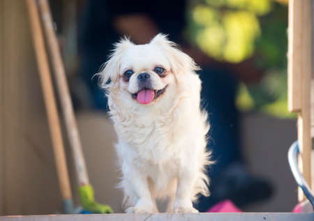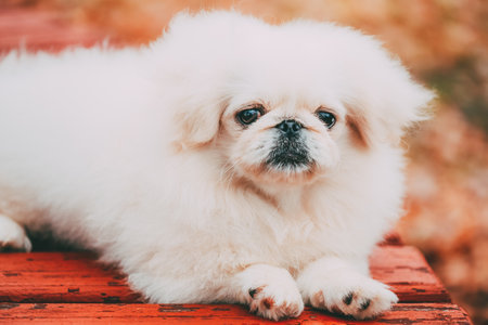 White Pekingese Pekinese Peke Whelp Puppy Dog Sitting On Wooden Bench