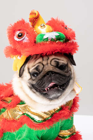 Happy dog pug breed in Chinese New Year Lion dance costume for Happy and lucky year