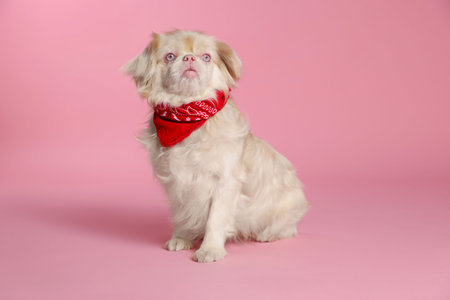 Cute Pekingese dog with bandana on pink background