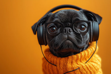 Cute black puppy in headphones listening to music on orange background.
