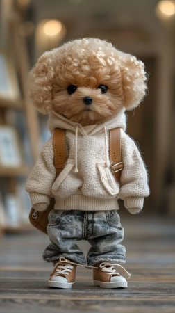 A toy poodle in a hoodie and jeans stands on wood floor, smiling and happy