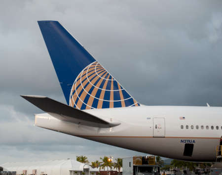 Kailua Kona, Hawaii, February 19, 2011: Tail of United Airlines Boeing 777 now merging with Continental Airlines, sports the Continental Airlines logo.