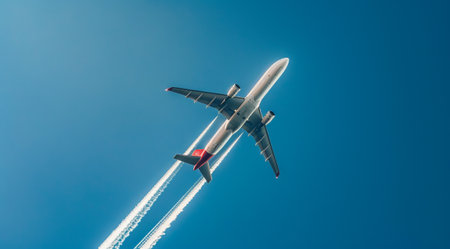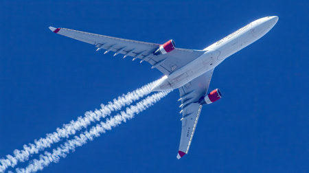 Route of an airplane with white contrail in the blue sky. Plane flies and draws route in the clear blue sky. transport