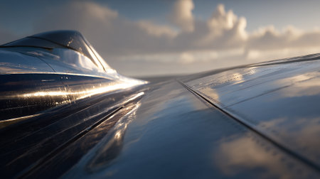 Two large jet engines shine brightly against a clear blue sky as the sun sets, casting a warm glow on their metallic surfaces. The focus is on the powerful turbines, showcasing engineering marvel.